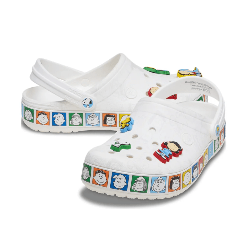 Jibbitz™ de Charlie Brown, Snoopy, Lucy, Linus, Sally y Woodstock. Este estilo relajado es un calzado fácil de poner para el día a día, con toques de color alegres y elementos nostálgicos de Peanuts™.